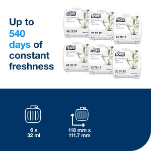 Tork Constant Air Freshener Refill A3: Combat odours in your washrooms effectively and efficiently with the Tork Constant Air Freshener in a subtle Odour Neutraliser scent. This air freshener system doesn’t simply mask smells – it eliminates them as it contains an odour neutraliser and a hint of lemongrass for pleasant freshness. Keep work simple for cleaning staff with the Tork Constant Air Freshener Dispenser, which can be installed at a reachable height for easy maintenance.