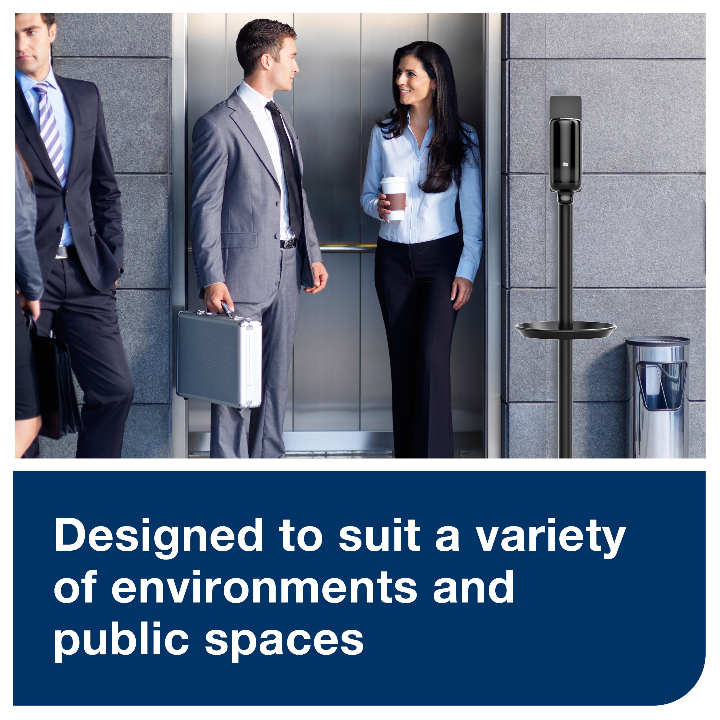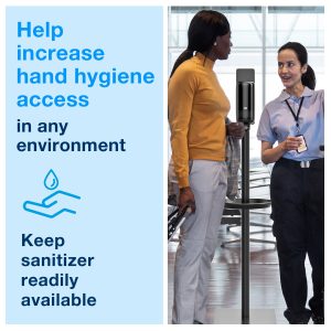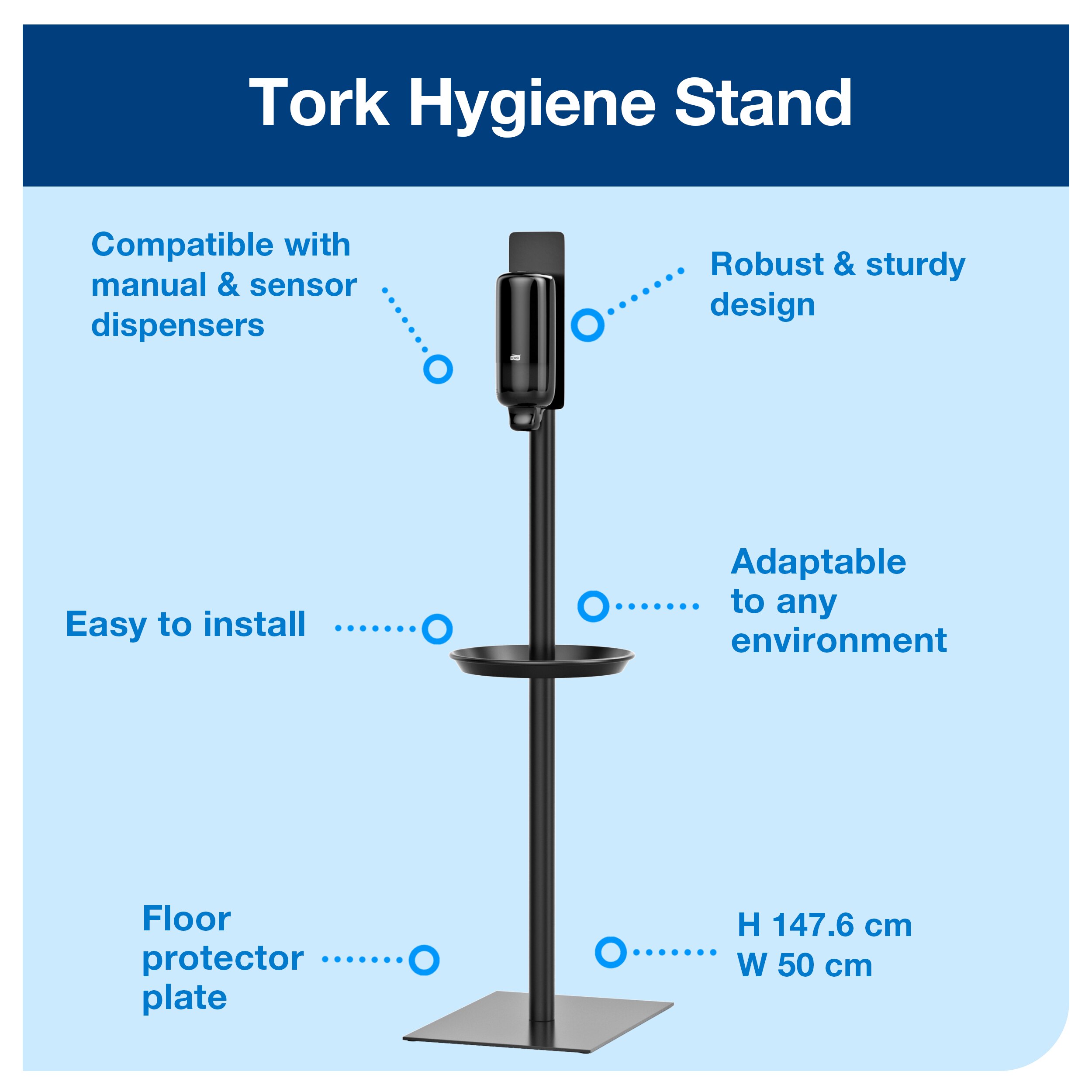 Tork Hand Sanitiser Hygiene Stand Black S1, S2, S4: Improve hand hygiene throughout your facility with this Tork hygiene stand for hand sanitiser dispensers. Place the stand wherever it’s most needed, so hand hygiene is accessible to everyone in high-traffic areas or out-of-the-way locations, even if there is no water supply. This robust and sturdy metal hand sanitiser stand is compatible with Tork S1, S2 and S4 dispensers, meaning you can choose from Tork gel, foam and liquid hand sanitisers as well as manual and sensor dispensers.