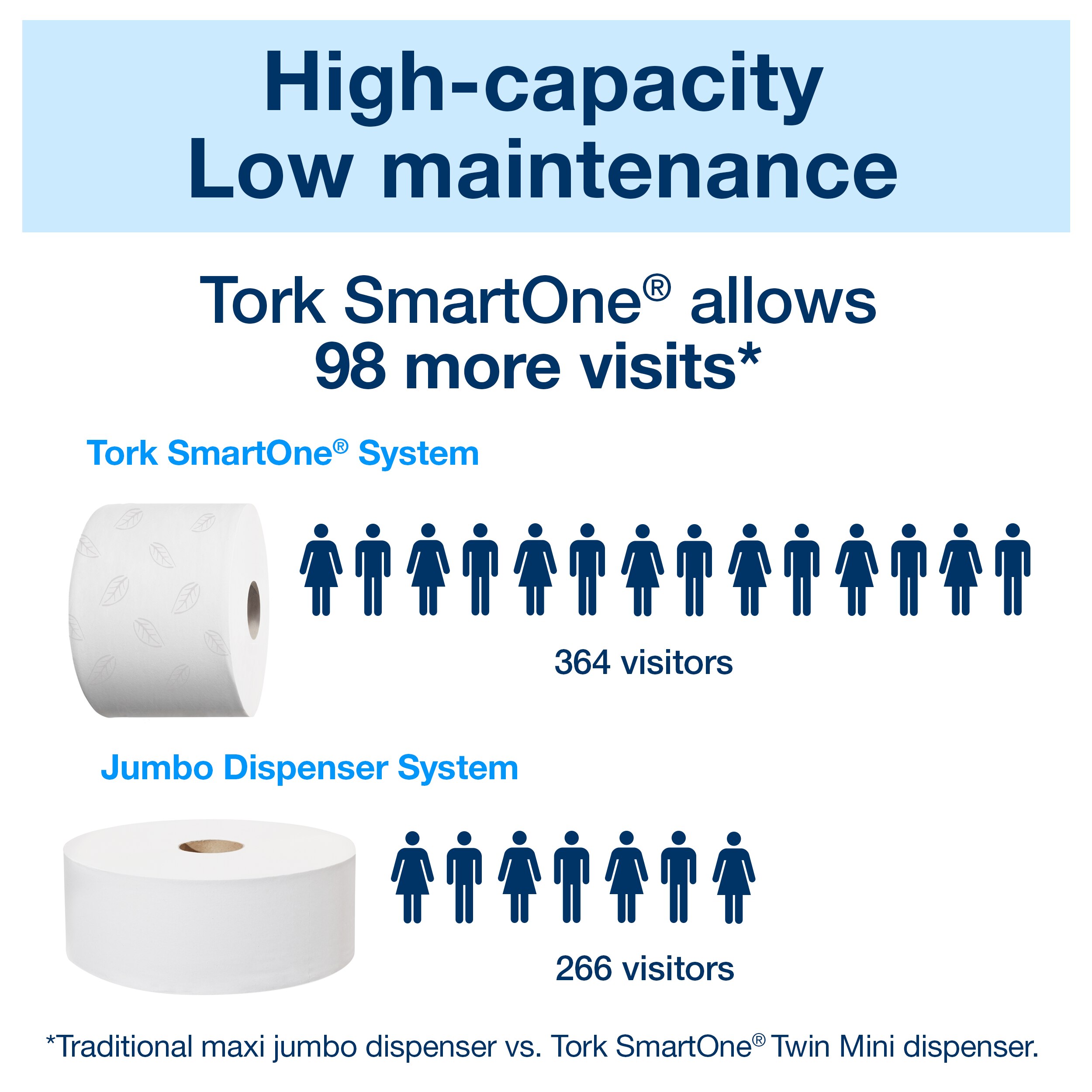 Tork SmartOne® Mini Toilet Roll White T9: Run-outs and blockages can make it hard to manage washrooms. Our Tork SmartOne® Mini Toilet Roll disintegrates quickly for reduced maintenance and features a SmartCore® core removal for simple refilling. The Tork Easy Handling® Bag removes the need for fussy packaging. Use with a variety of Tork SmartOne® Mini Toilet Roll Dispensers in spaces with low, medium or high traffic. The single-sheet dispensing system cuts use by up to 40% compared to traditional jumbo toilet roll dispensers, lowering consumption and costs.