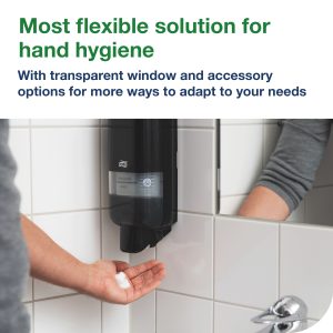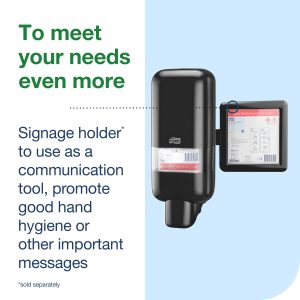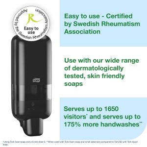 Tork Soap and Sanitiser Dispenser Black S4: The Tork Soap and Sanitiser Dispenser fits any location. This dispenser can be used with a wide range of Tork soaps, sanitisers and shower creams in hygienically sealed bottles to suit your business needs. Its reliable dispensing, variable dose size and certified easy-to-use design promote good hand hygiene for all users. Make a lasting impression on your guests with the functional and modern design of our most versatile soap and sanitiser dispenser.
