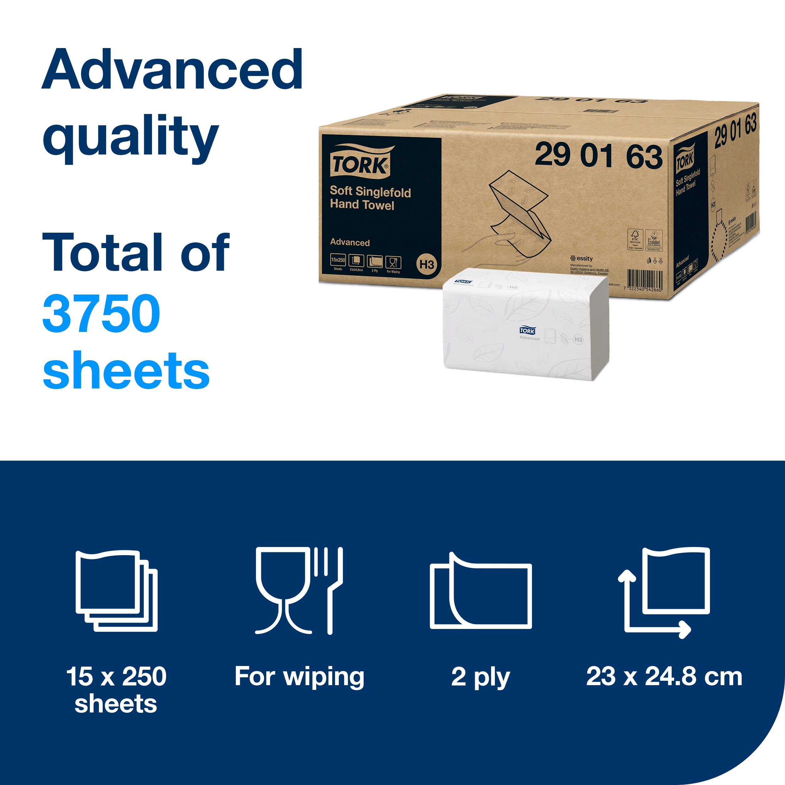 Tork Soft Singlefold Hand Towels White H3, Advanced, 15 x 250 Sheets, 290163
