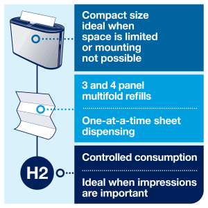 Tork Xpress® Countertop Multifold Hand Towel Dispenser Stainless Steel H2: Make a great impression on your washroom guests with this high-end countertop paper towel dispenser. It fits easily into a luxurious washroom setting, where the durability of the stainless steel combines with a high-quality look and brushed steel shine. To keep it looking clean and save time for your staff, it has a fingerprint-resistant coating. It’s also easy for staff to see when hand towels are low, thanks to the colour-coded exterior refill indicator. Carbon neutral – produced with certified renewable electricity and compensated with climate projects.