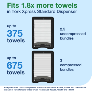 Tork Xpress® Multifold Hand Towel Dispenser White H2: Impress guests in low to medium-traffic washrooms with the premium look of the Tork Xpress® Multifold Hand Towel Dispenser. Plus, reduce waste and boost your environmental credentials with one-at-a-time dispensing, which cuts consumption of paper towels and improves hygiene. Your staff will also appreciate making fewer refill runs – this towel dispenser has a high capacity that can fit up to 2.5 bundles, meaning more people are served in one go.