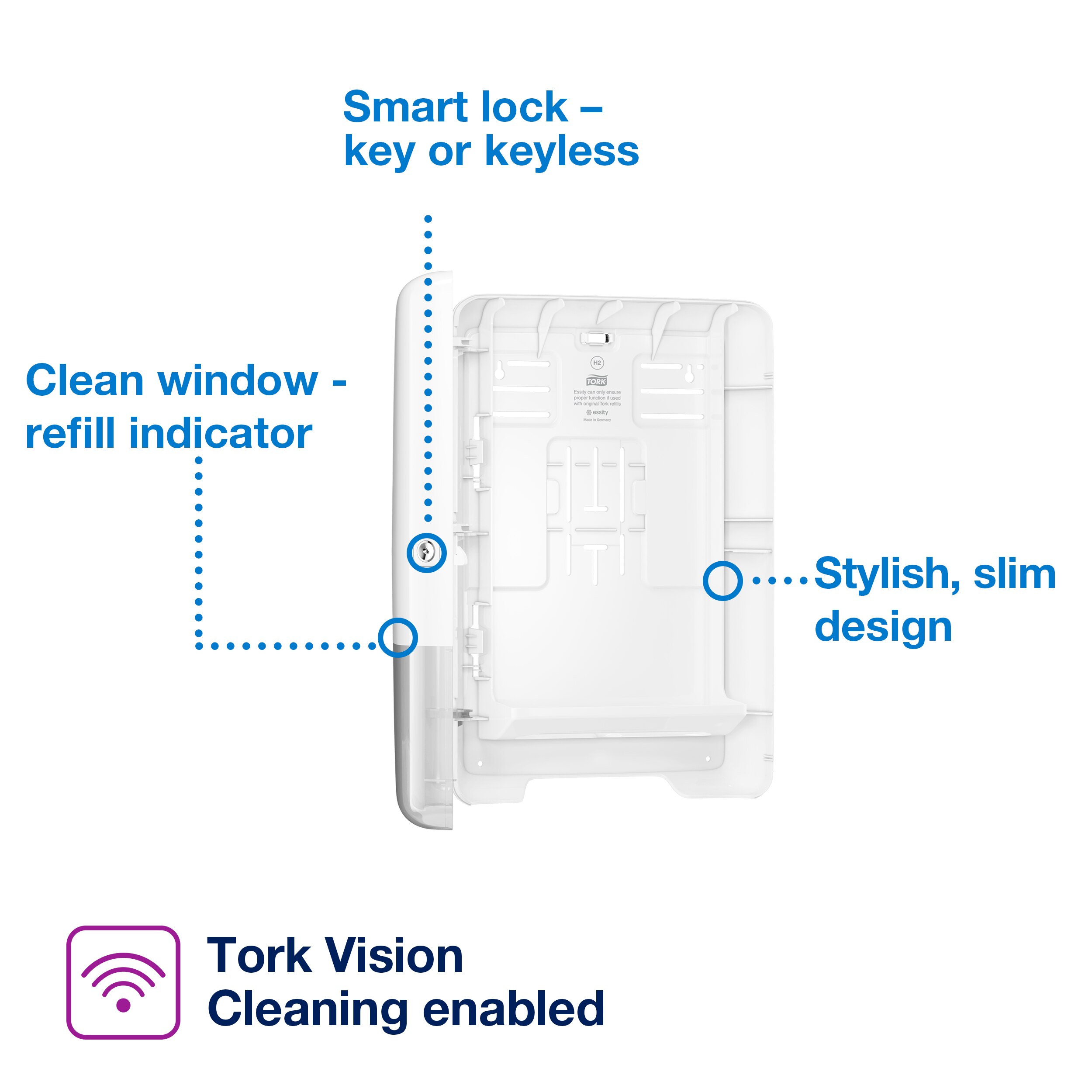 Advantages at a glance: + One-at-a-time dispensing to cut consumption and boost hygiene + Easy to refill + High capacity that fits up to 2.5 bundles + Easy mounting via pre-drilled mounting points + Ideal for low to medium-traffic washrooms